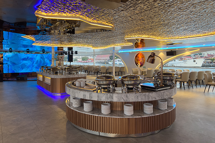 The Planet Cruiseで提供されるのは、ウェルカムドリンクに始まり、各国料理が揃ったインターナショナルビュッフェ、ライブ演奏、タイ舞踊、そしてニューイヤーギフトと、豪華な内容です。