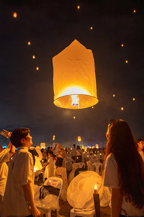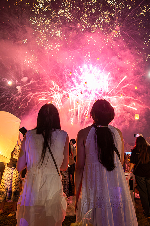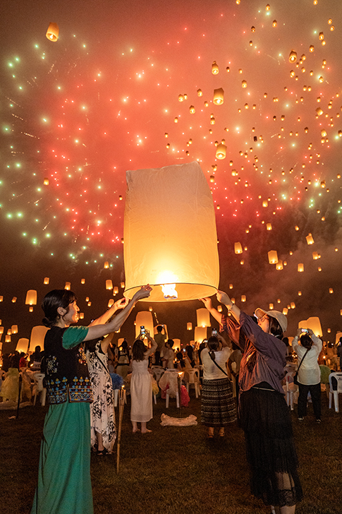 指定席に用意されたランタンに火を灯し、数千人が一斉に夜空へ放つ瞬間は圧巻。